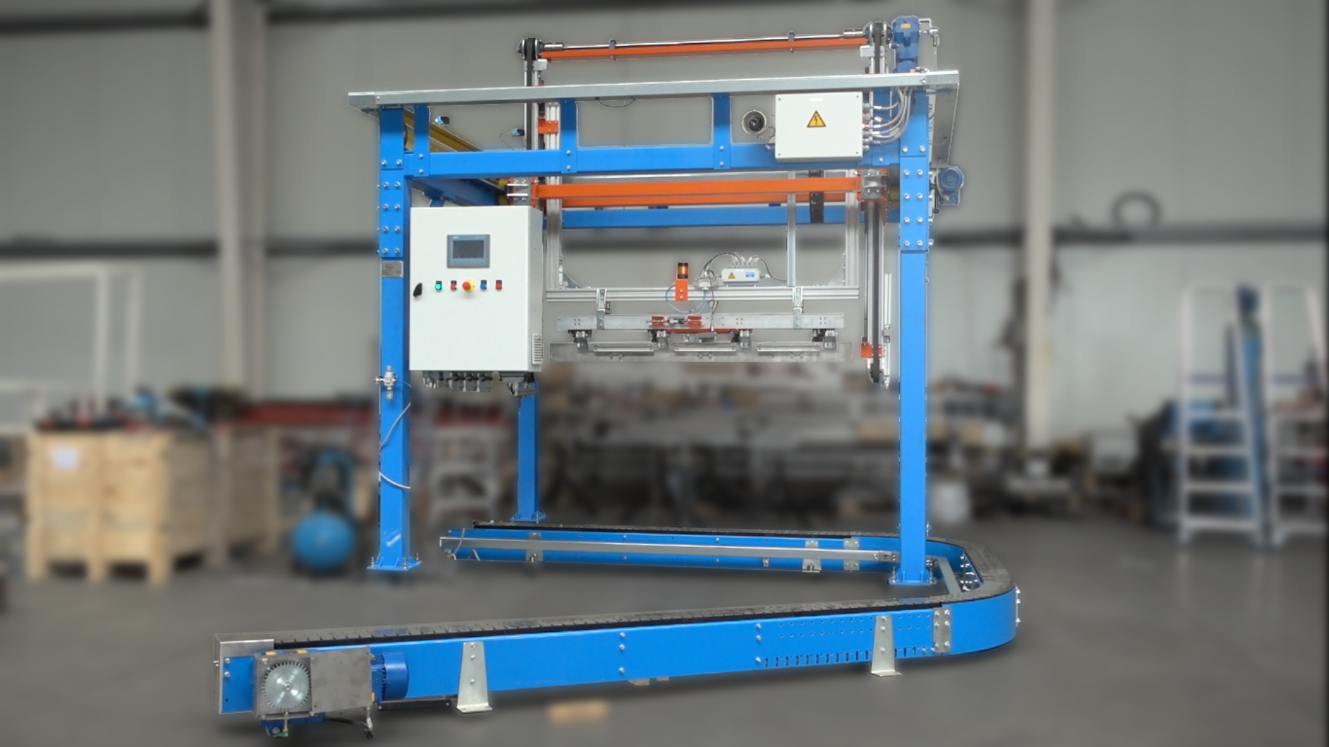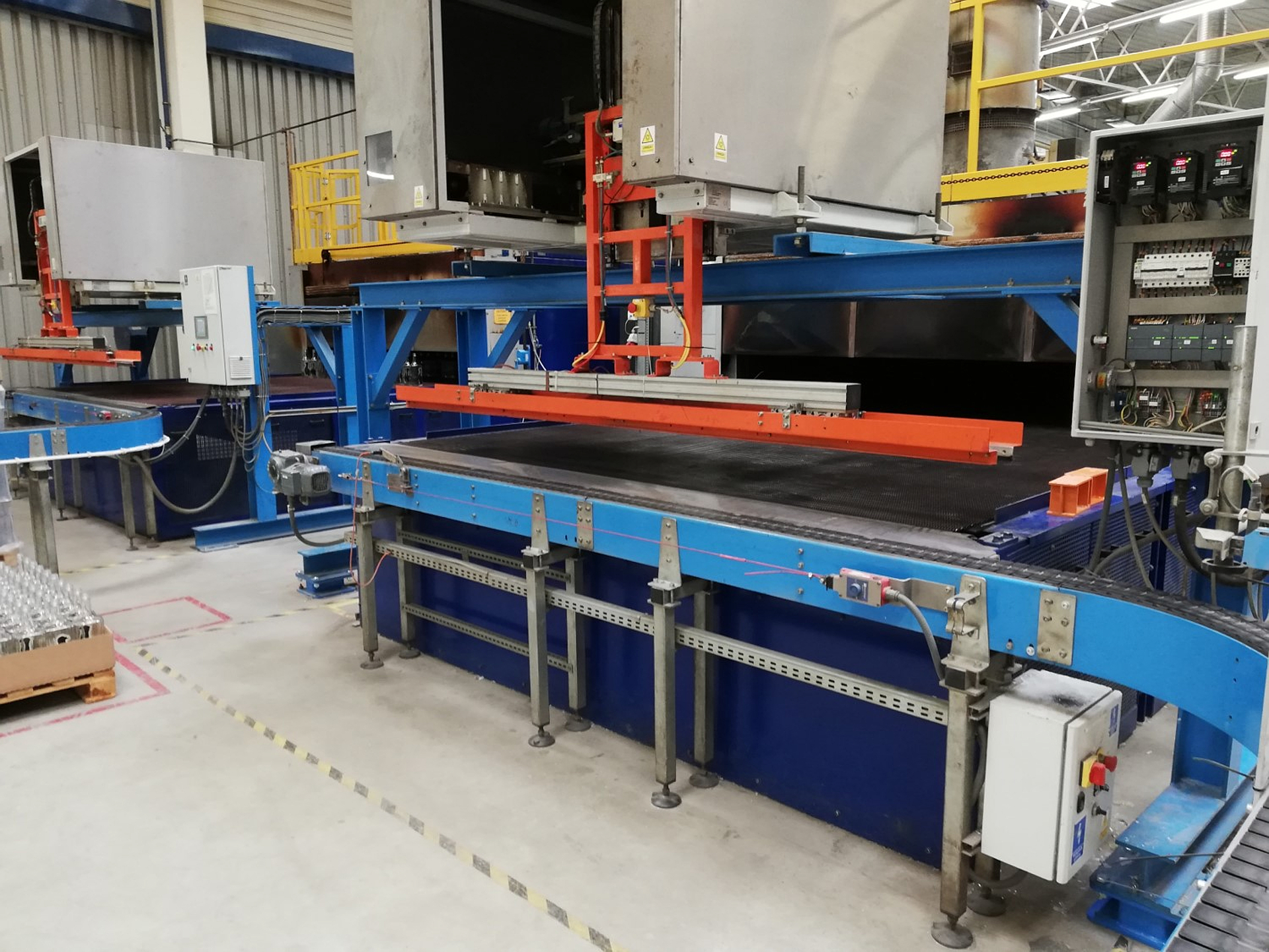 We offer a pusher that is designed to move glass packages from a single conveyor thread to a multi-row stress relieving machine table or packing table. The "anti domino” system prevents the transported items from tipping over - and additionally rearranges the rows to optimize space. Our pusher is ideal for high-volume production lines.